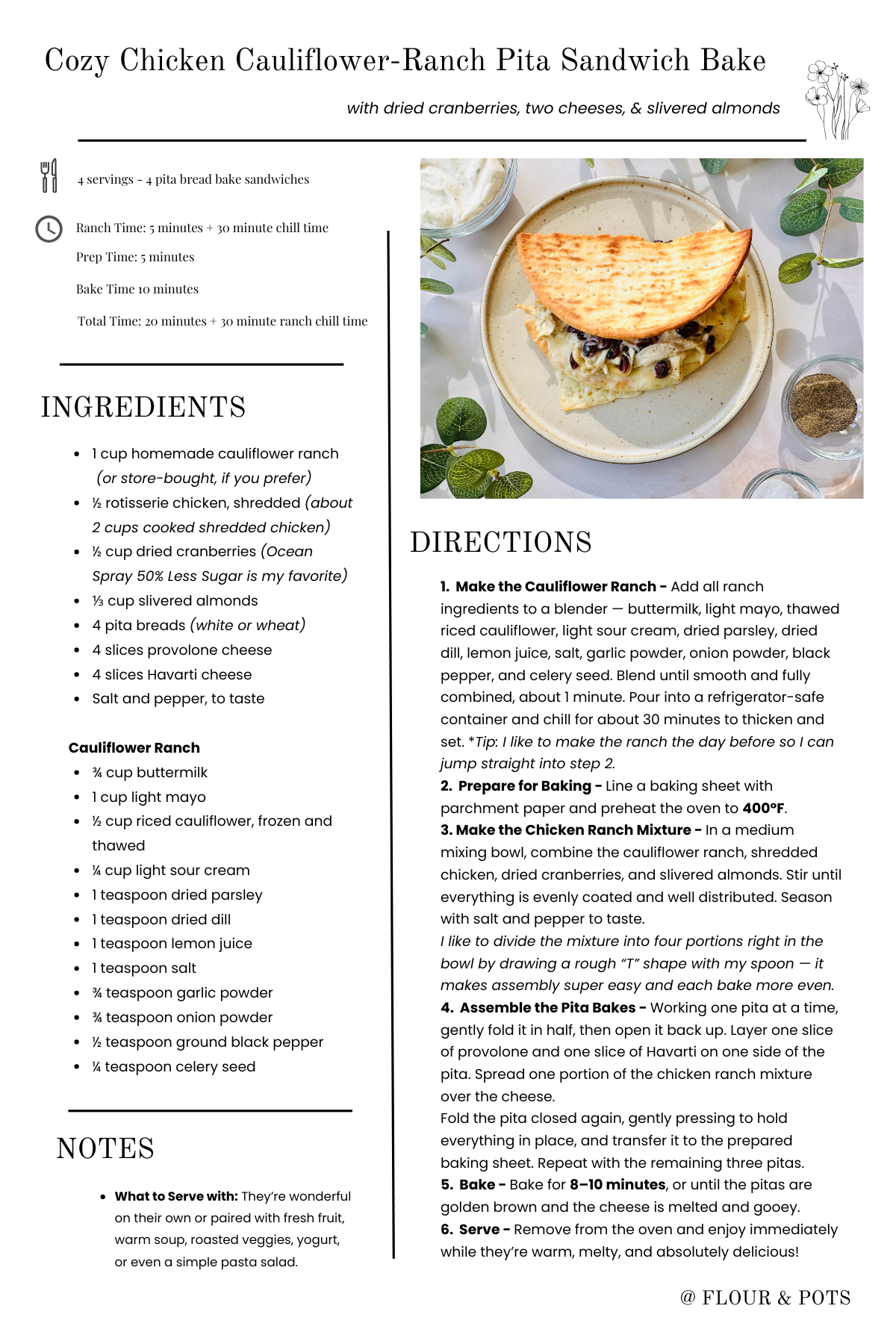 These chicken cauliflower-ranch pita bread bakes are exactly that. They’re basically a cozy, amped-up, warm version of a chicken salad sandwich — but made with a fun homemade cauliflower ranch, sweet and tangy dried cranberries, the satisfying crunch of slivered almonds, and a quick 8–10 minutes in the oven. They are warm, comforting, melty, and truly melt-in-your-mouth delicious.